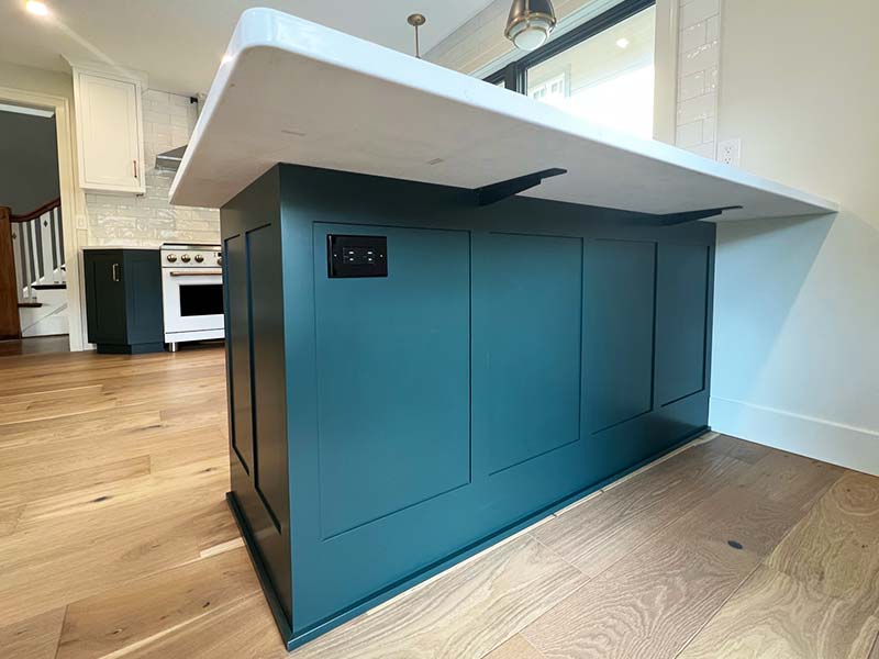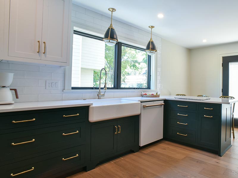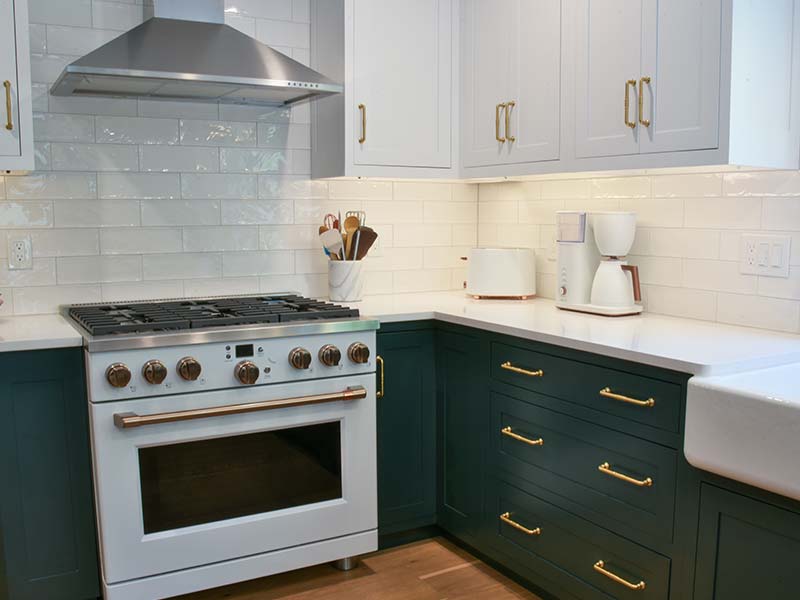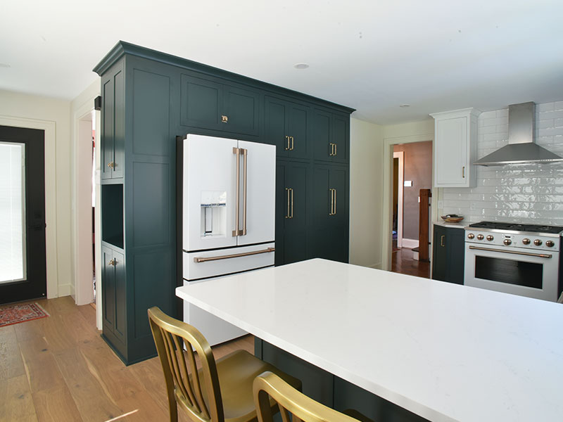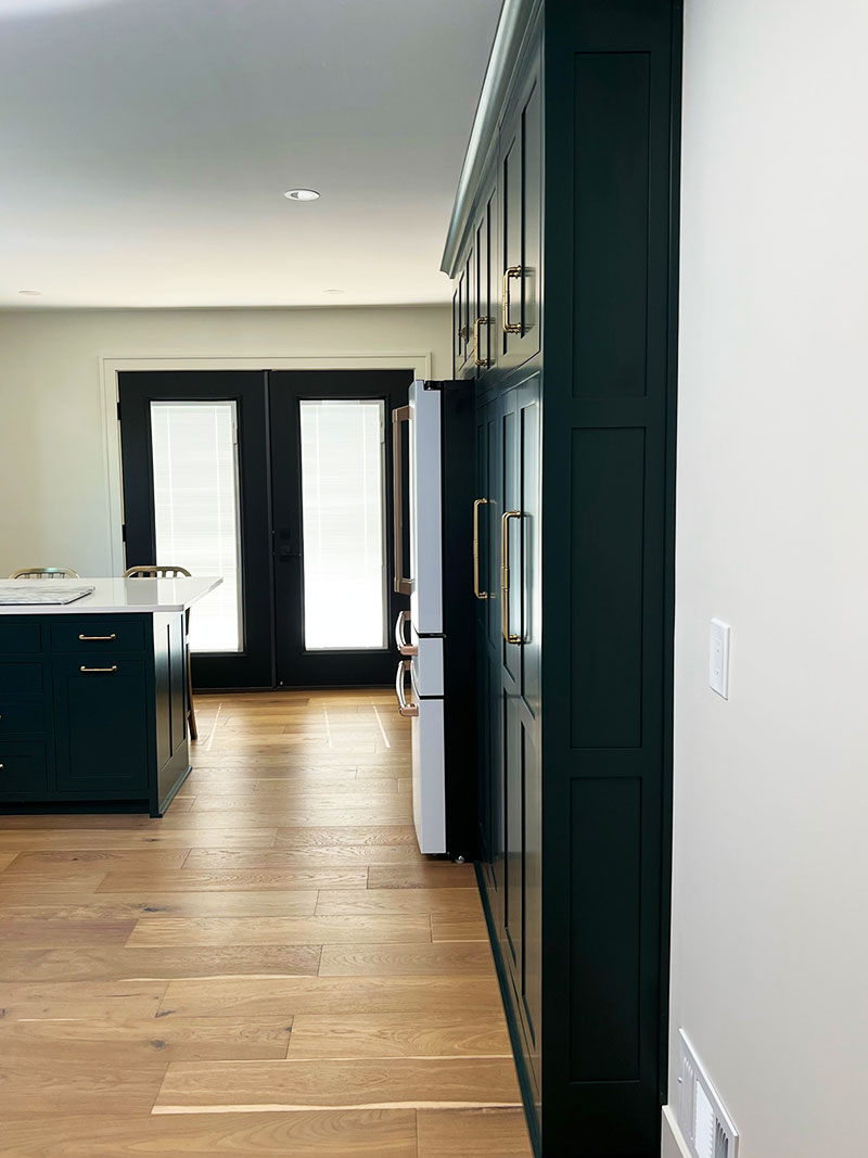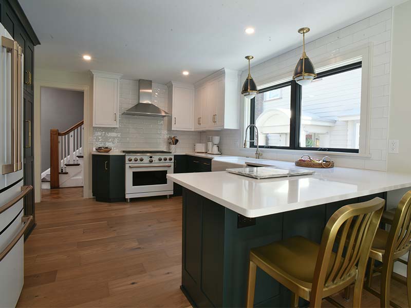 This kitchen boasts a crisp color palette with deep jeweled green and white cabinets. A textured and reflective white backsplash and counters accented with brushed gold and matte black create a perfect complement to the warmth of rustic oak engineered hardwoods that ground the space.