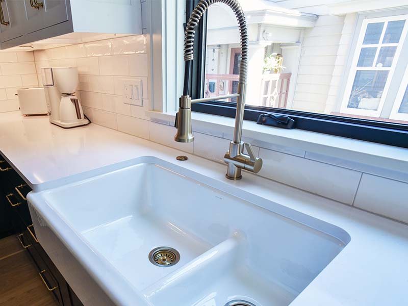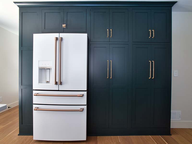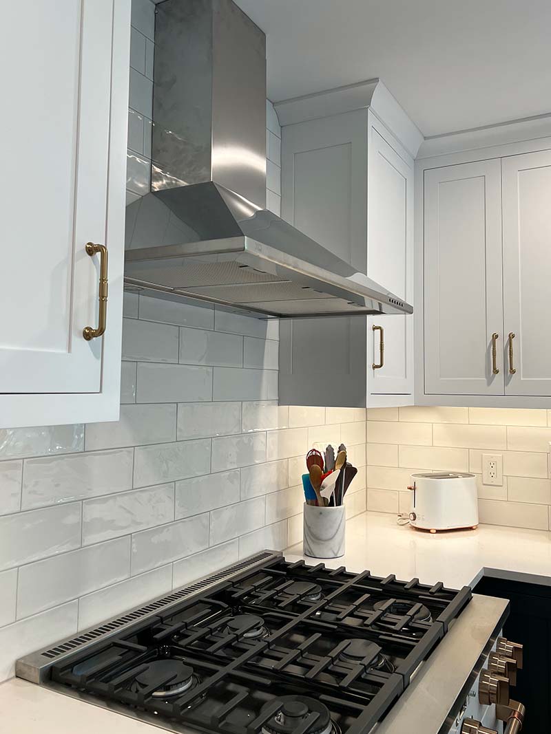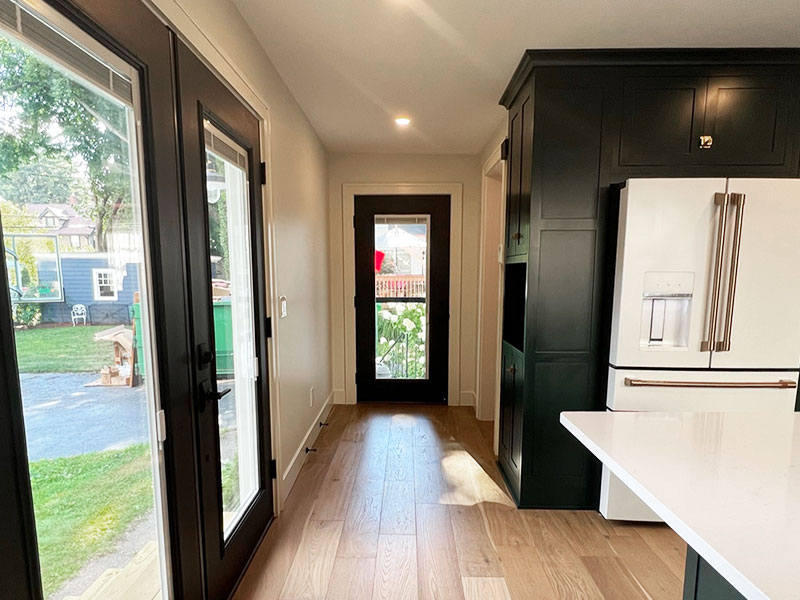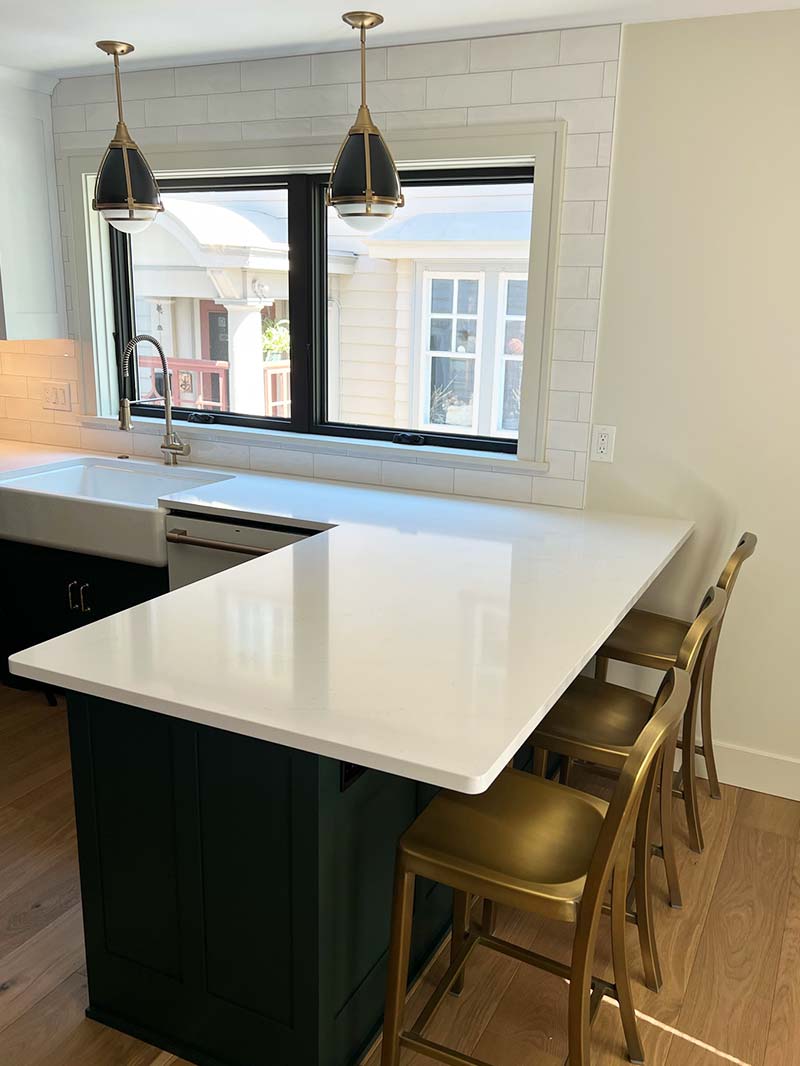To bring extra light into the space we added large windows and a double french door to the backyard and future deck.  The peninsula provides the perfect casual dining space and ample extra counter space.  A long expanse of 15 inch deep pantry space along the new refrigerator wall to hold bulk food storage, and the perfect solution to keep all the small appliances in one convenient location.  The matte white GE Cafe appliances are the perfect accents for this updated space.
