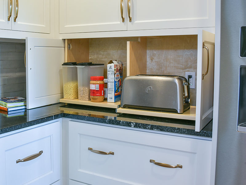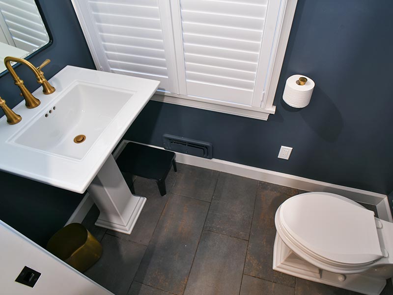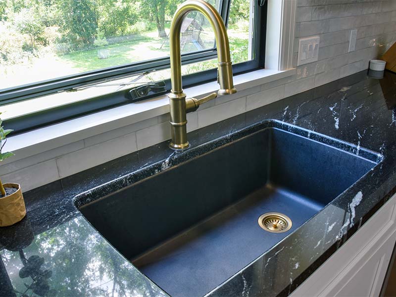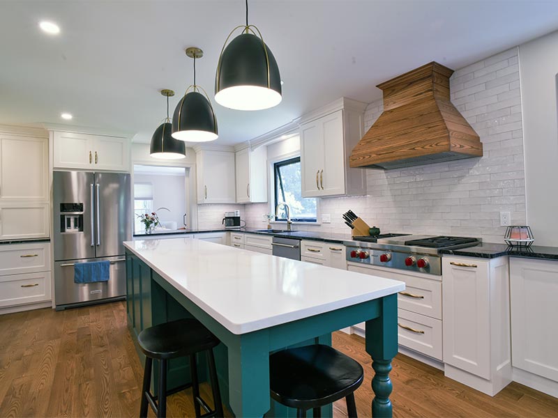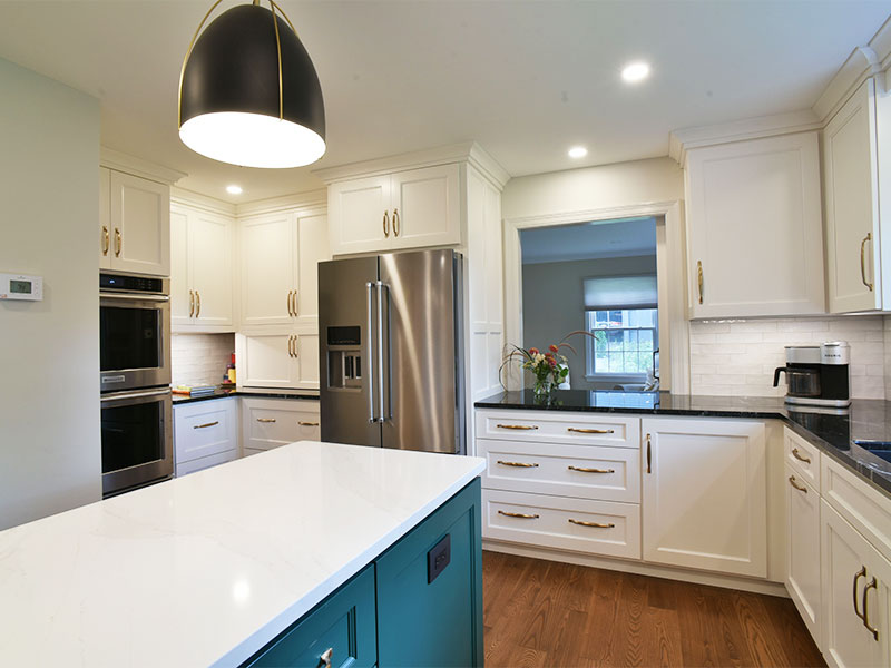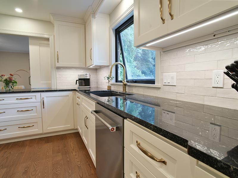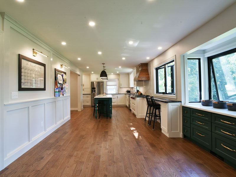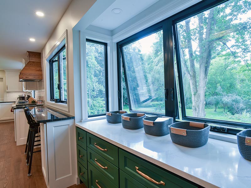 The approach to the kitchen was for flow. We removed the wall between the dining room and kitchen to allow for a large island that accommodates seating, storage, a microwave drawer and ample, clear counter space for baking. The large awning windows provide uninterrupted views of the gorgeous backyard, creek and protected wetlands while maximizing the light to the eat-in kitchen.