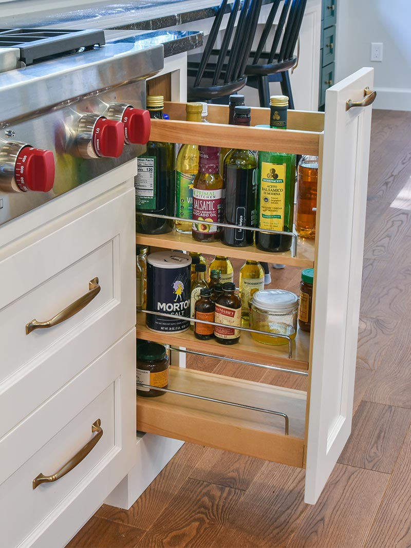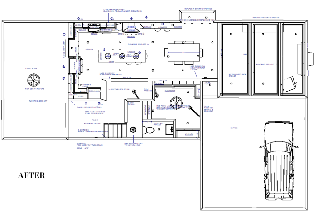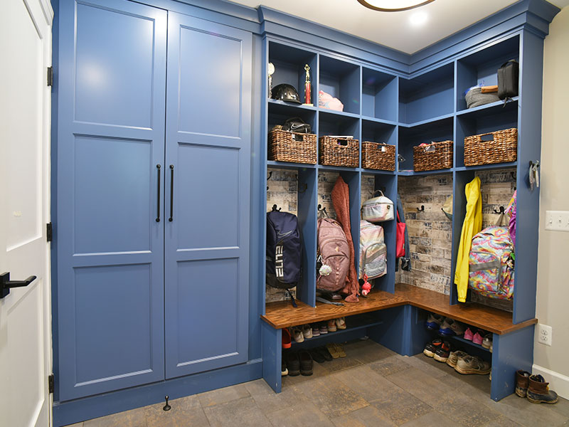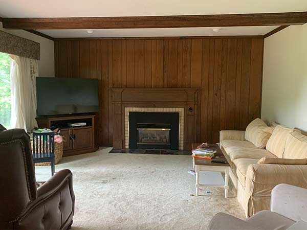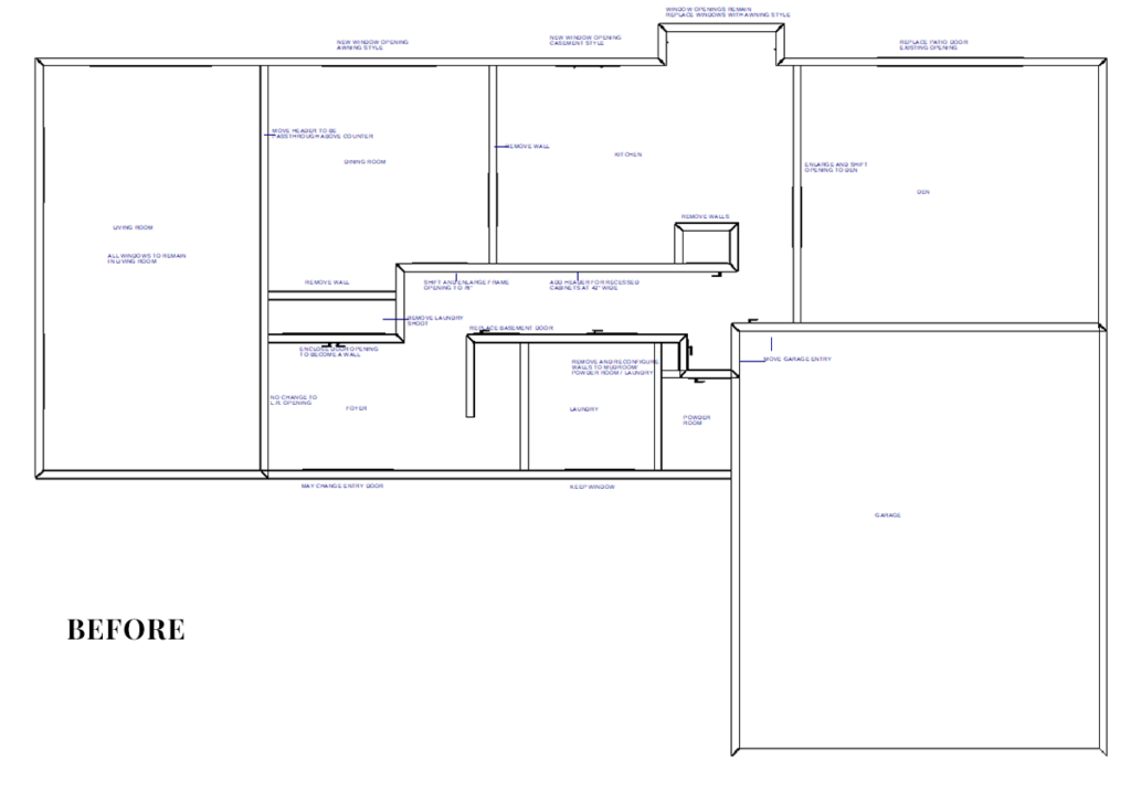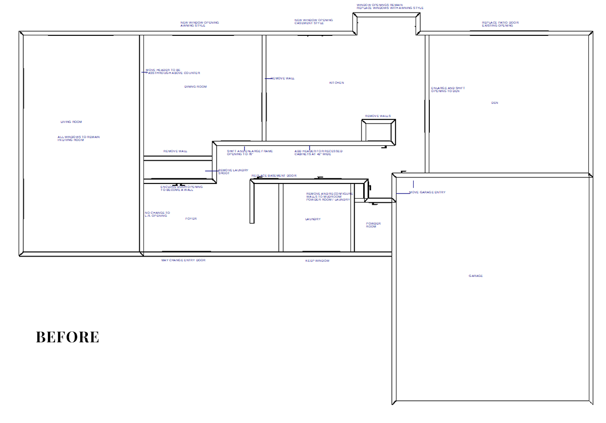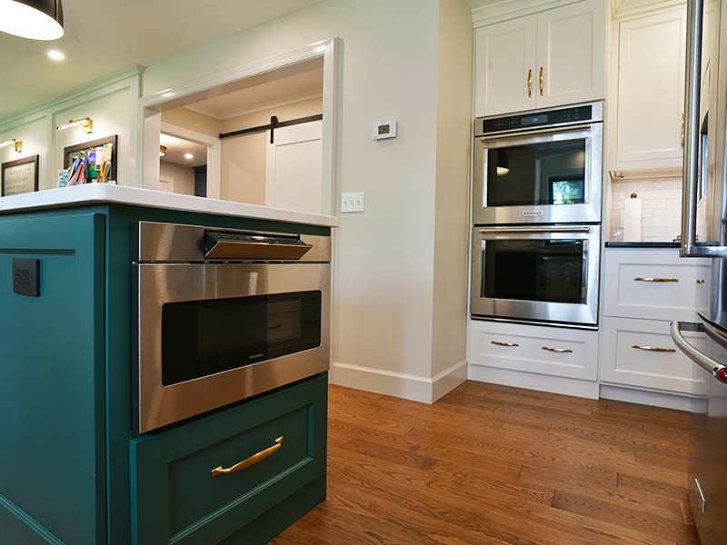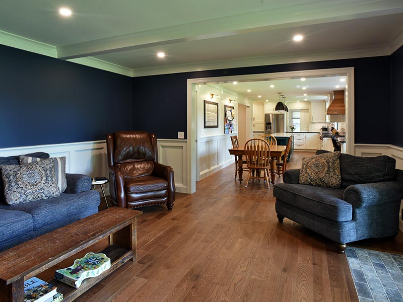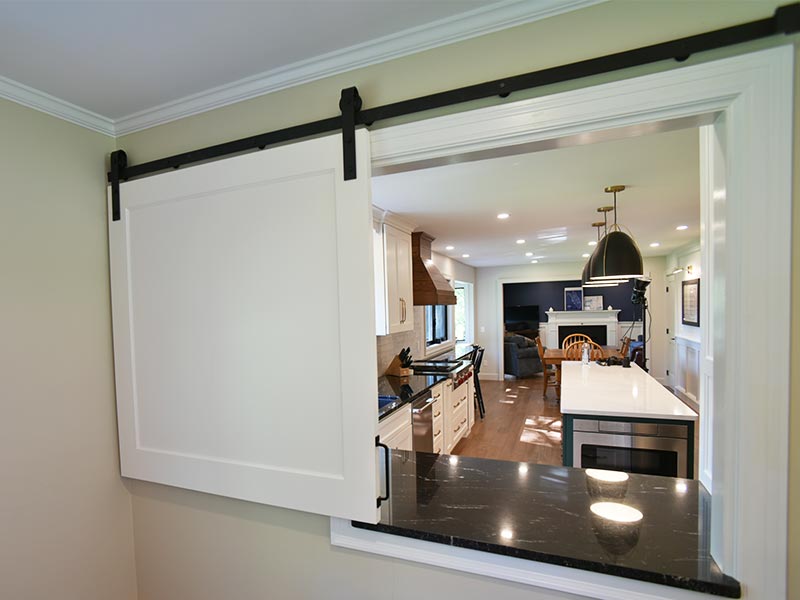 The formal living room in this home is used primarily as a family room and play space so we created a pass-through to the kitchen to allow an opportunity for snack distribution and open communication to the kitchen. The barn door here lets the occupants muffle TV and play noise to the kitchen and Den.