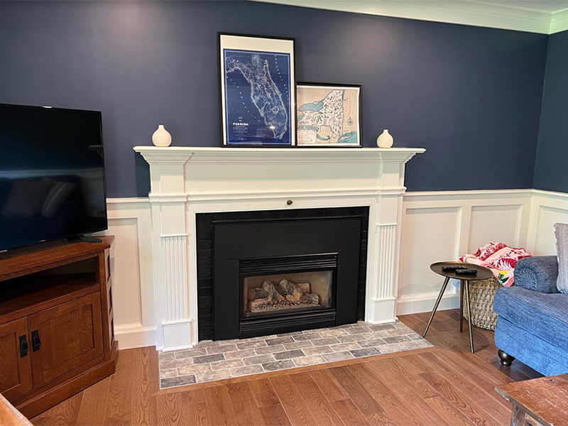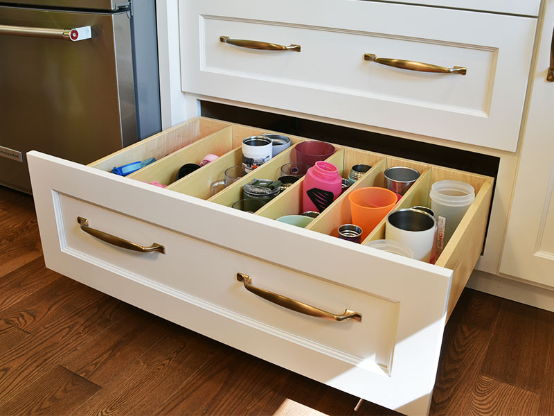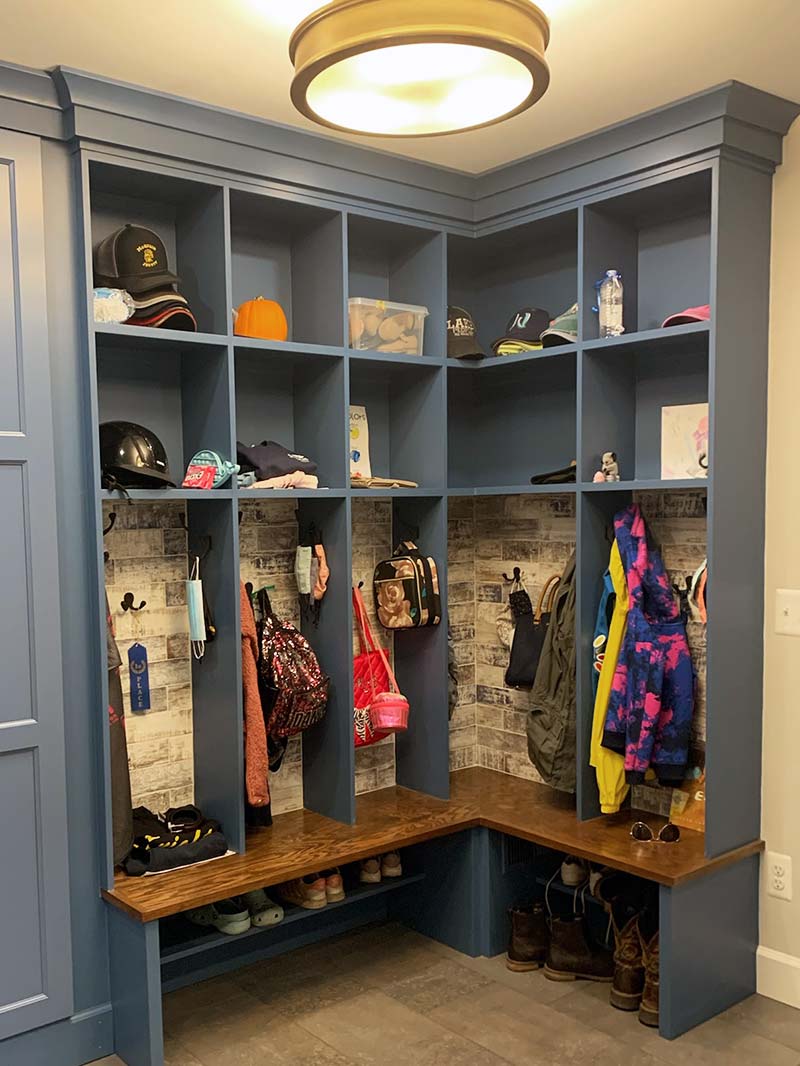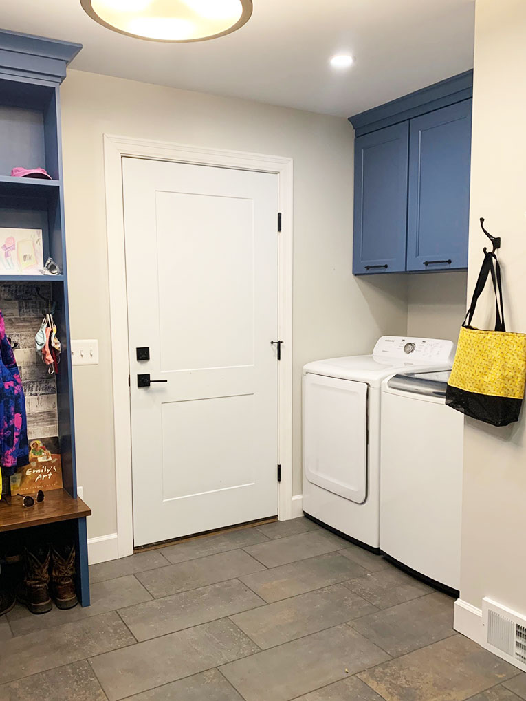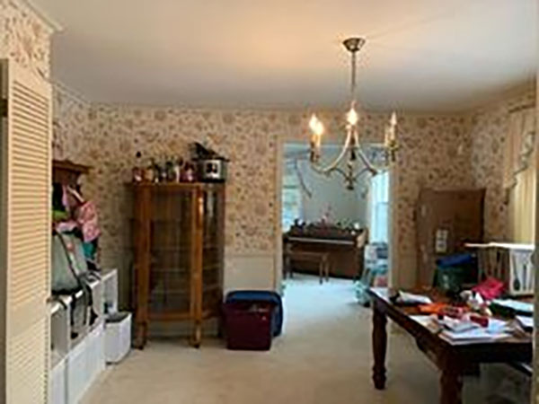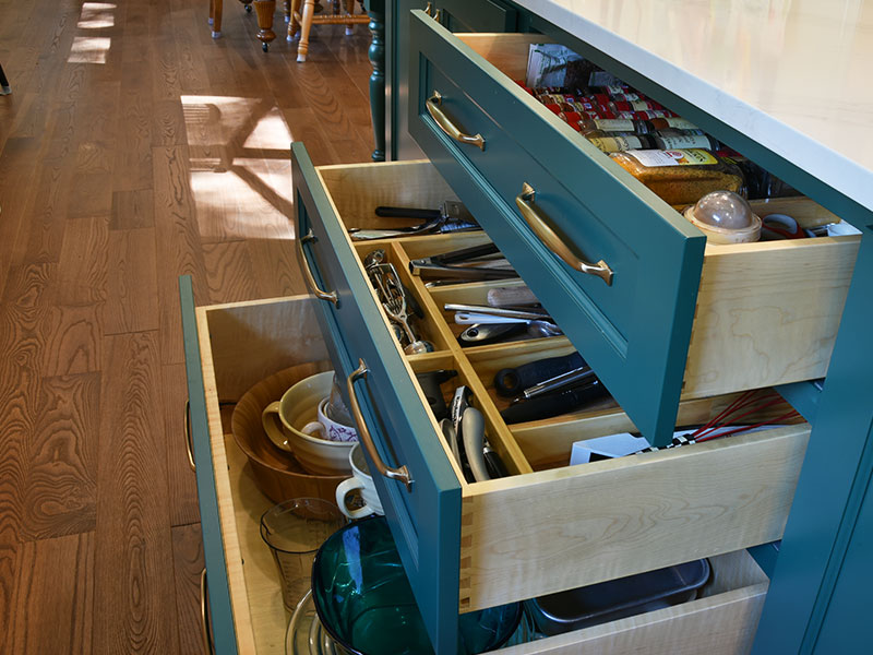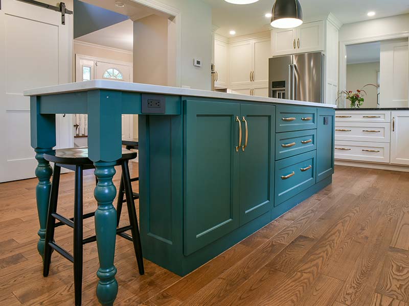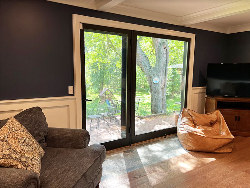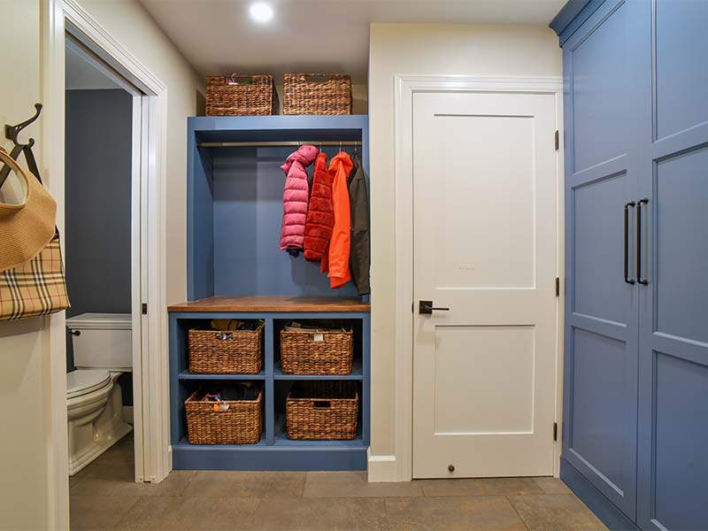 The formal living room in this home is used primarily as a family room and play space so we created a pass-through to the kitchen to allow an opportunity for snack distribution and open communication to the kitchen. The barn door here lets the occupants muffle TV and play noise to the kitchen and Den.
